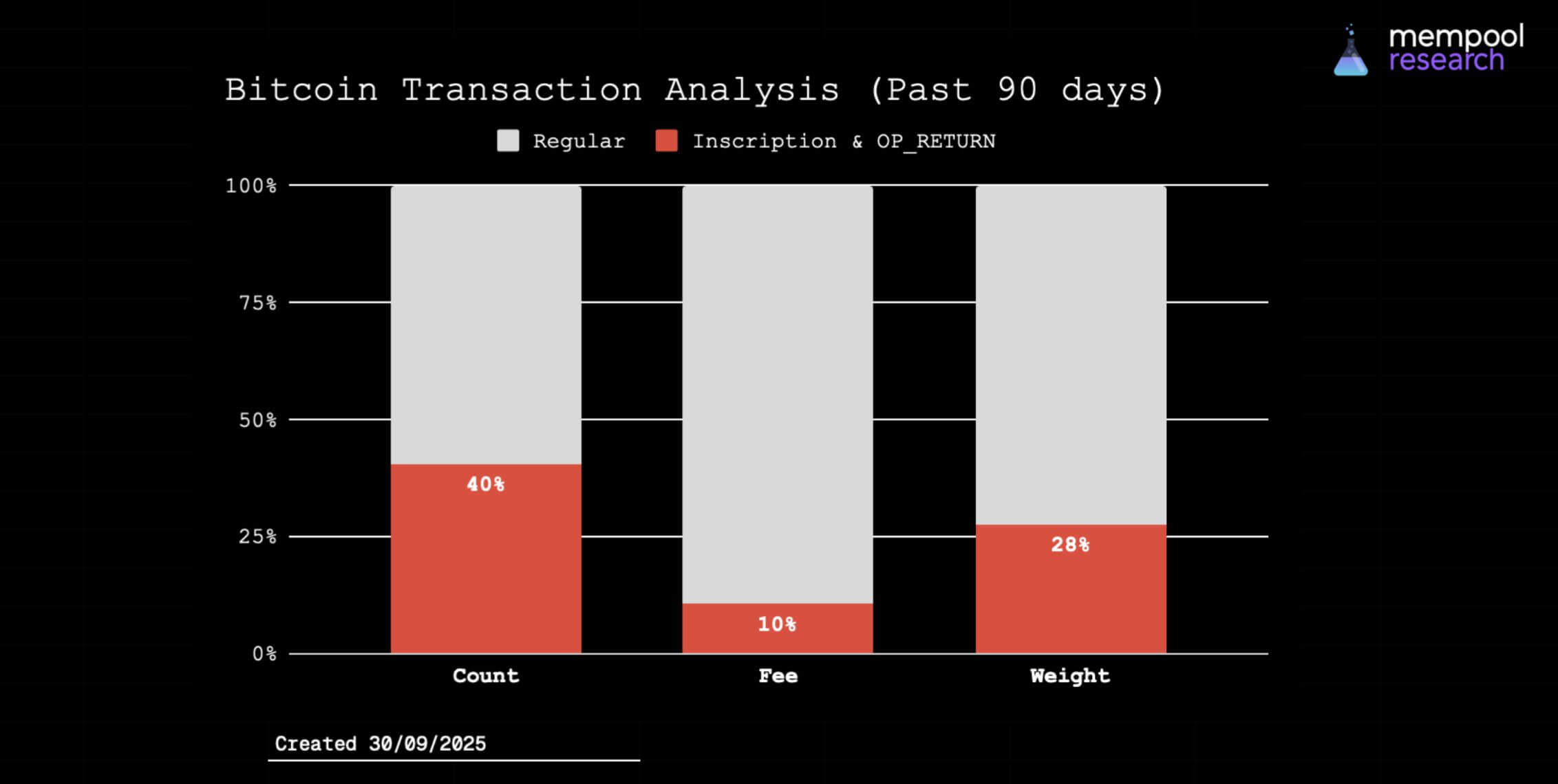 According to Mempool Research data, inscriptions and OP_RETURN transactions already account for 40% of all Bitcoin transactions by count, 10% by fees, and 28% by weight.
