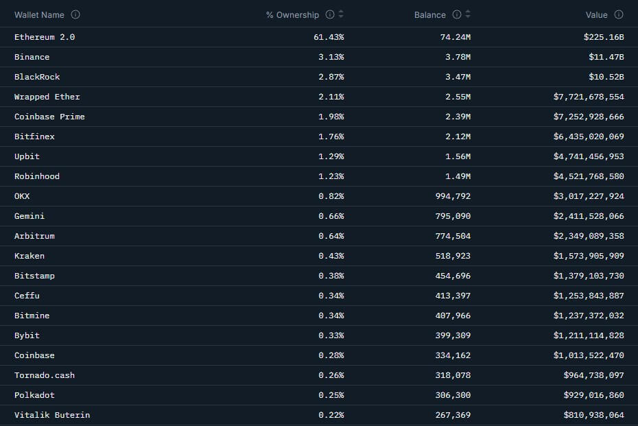 This isn’t speculative hoarding, but rather an operational infrastructure. Nansen’s holder composition shows the largest addresses are staking contracts, institutional custodians, and ETF wrappers, not whale wallets.